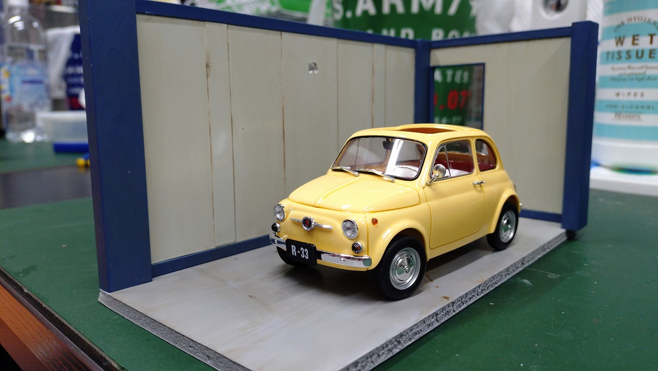 SHANさん、できた壁を組み立ててフィアットをおいてみました。