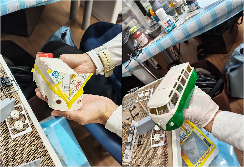 マスキングをして、ボディの半分をきれいなパークグリーンにされましたよ♪