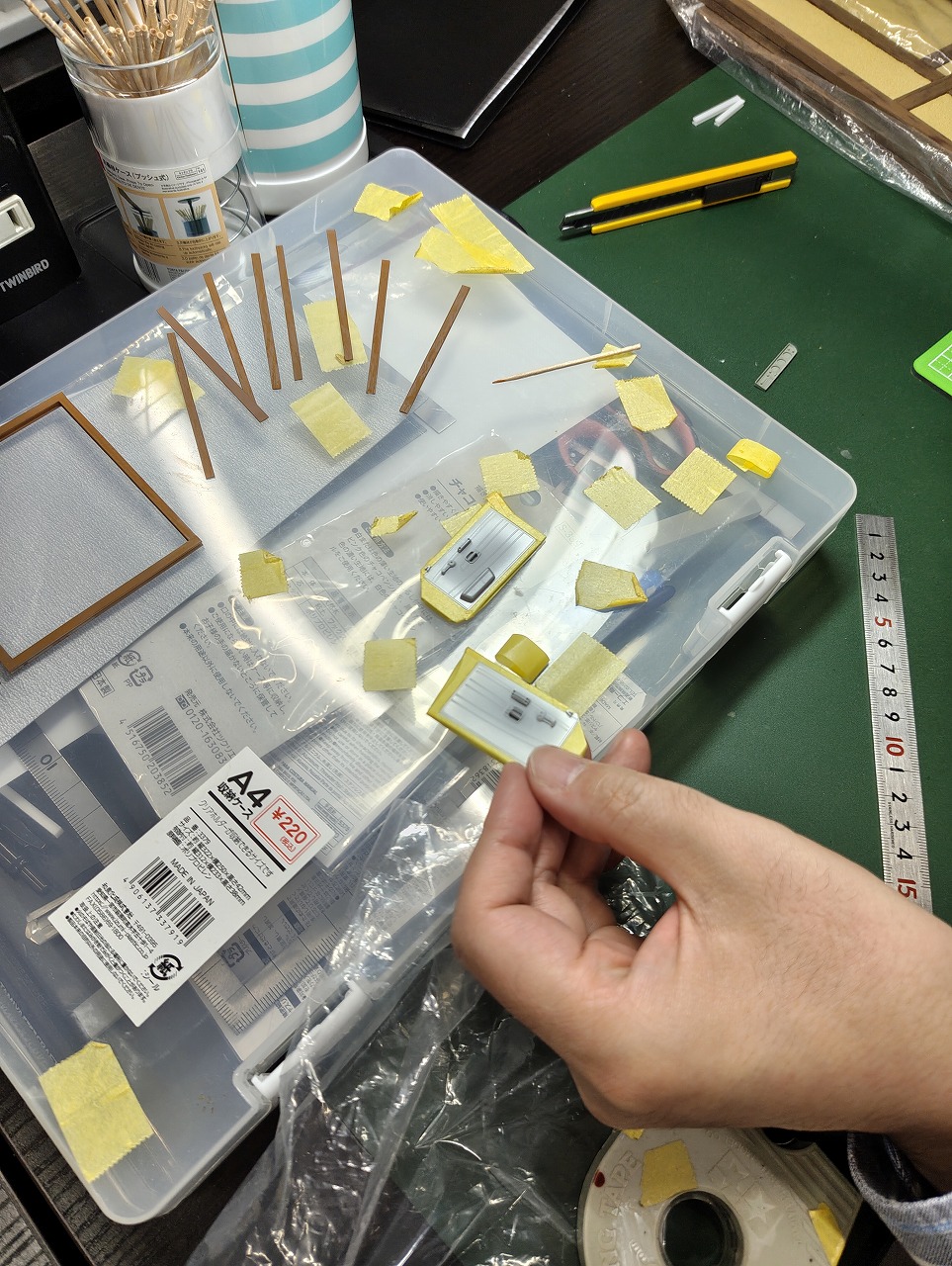 SHANさん、この日は、1/12の和室の窓枠を木目調に塗装したり