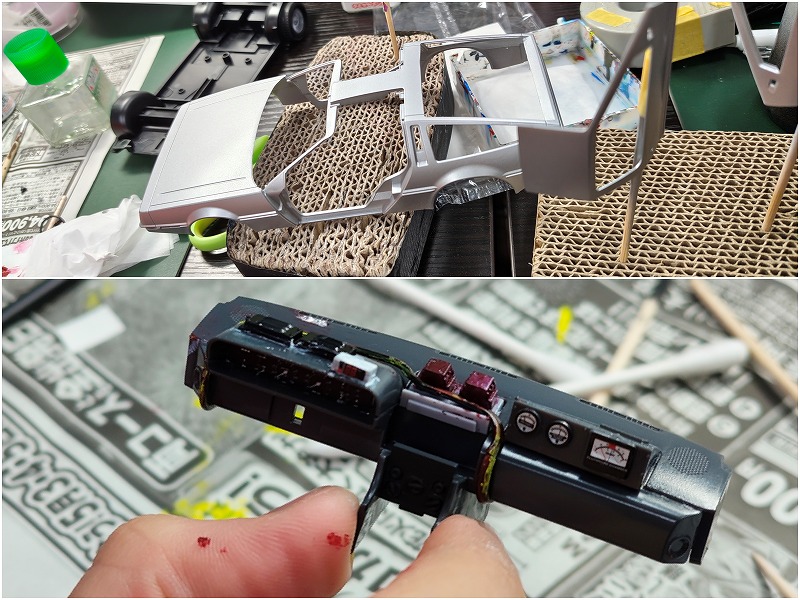 それから、運転席のメーターや計器類にデカールを貼ったり、