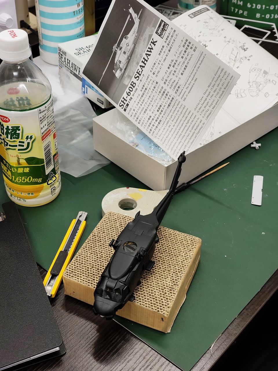コクピット内をマスキングして全体を黒サフで塗装されました。