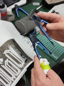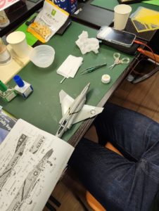 翼パーツの白のラインをプラ板で作ることにしたそう。